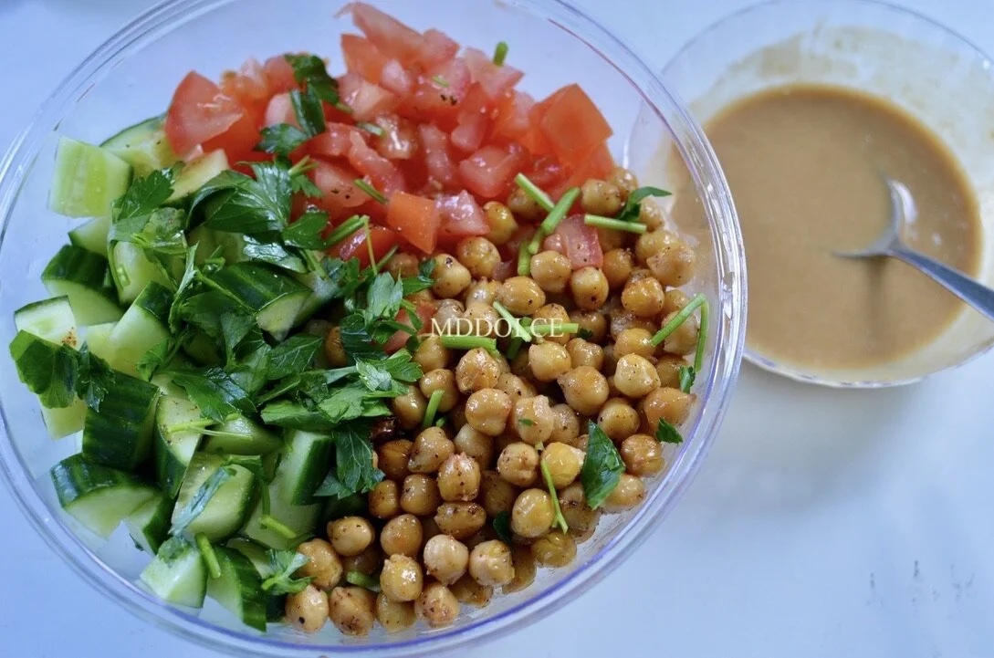 Salade concombre, tomate et pois chiche à la sauce fruit de baobab